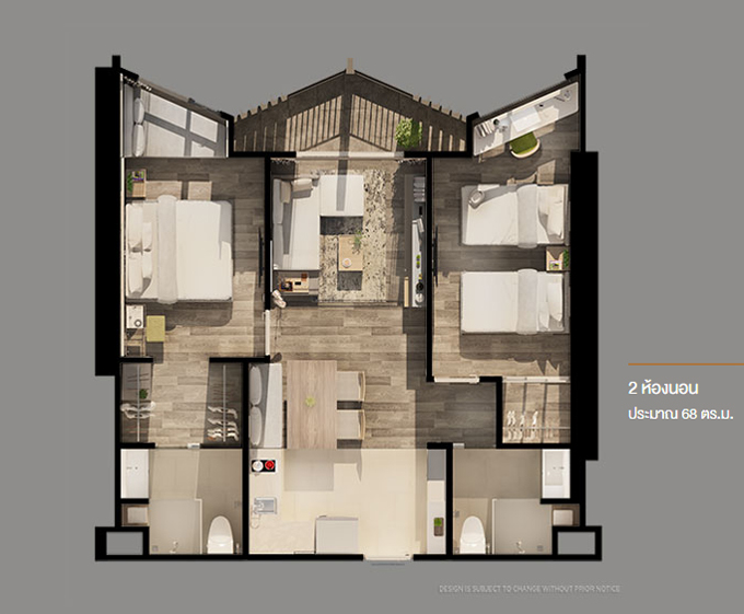 - 2 ห้องนอน พื้นที่ใช้สอยขนาด 68 ตร.ม.