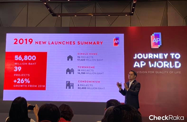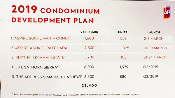 สรุปแผนการดำเนินงานธุรกิจอสังหาฯ ในปี 2562 เอพี เตรียมเปิดตัวโครงการใหม่จำนวน 39 โครงการ มูลค่ารวมประมาณ 56,800 ล้านบาท แบ่งเป็น คอนโดมิเนียม 5 โครงการ มูลค่า 22,400 ล้านบาท แนวราบ 34 โครงการ มูลค่า 34,400 ล้านบาท ตั้งเป้าหมายยอดขาย 41,800 ล้านบาท และเป้าหมายรายได้รวม 35,900 ล้านบาท (100%JV) ในครึ่งปีแรกเอพีเตรียมเปิดตัวโครงการใหม่ 21 โครงการ มูลค่า 30,440 ล้านบาท แนวราบ 17 โครงการ ประกอบด้วยบ้านเดี่ยว 6 โครงการ และทาวน์โฮม 11 โครงการ มูลค่ารวม 16,840 ล้านบาท และ 4 คอนโดมิเนียมใหม่ ได้แก่ ASPIRE สุขุมวิท-อ่อนนุช มูลค่า 1,600 ล้านบาท ASPIRE อโศก-รัชดา มูลค่า 2,500 ล้านบาท RHYTHM เอกมัย เอสเตท มูลค่า 3,200 ล้านบาท (โครงการร่วมทุน) และ LIFE สาทร SIERRA มูลค่าโครงการ 6,300 ล้านบาท (โครงการร่วมทุน)