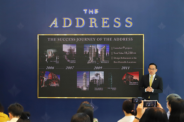 "นอกเหนือจากนั้น ยังเป็นการสานต่อความสำเร็จอันเป็นตำนานของกลุ่มสินค้าภายใต้แบรนด์ The Address ใน 9 โครงการที่ผ่านมา และยังเป็นที่กล่าวขานถึงปัจจุบัน ทั้งความเป็นที่สุดด้าน 'คุณค่า' ความละเมียดละไมในการออกแบบที่ผสานศิลปะชั้นสูงทั้งสไตล์ตะวันตก และตะวันออกเข้ามาเป็นส่วนหนึ่งของการใช้ชีวิตของคนเมืองระดับบนได้อย่างงดงามและเป็นเอกลักษณ์ บนที่สุดของ 'ทำเล' ที่เป็นสุดยอดทำเลที่น่าถวิลหาและความภาคภูมิใจในการครอบครอง และที่สุดของ 'มูลค่า' ที่เพิ่มขึ้นทั้ง 9 โครงการด้วยอัตราการเติบโตของราคาเฉลี่ยที่ 40% เปรียบเสมือนของสะสมที่จะสืบทอดจากรุ่นสู่รุ่นเป็นอย่างดี" นายวิทการ กล่าว