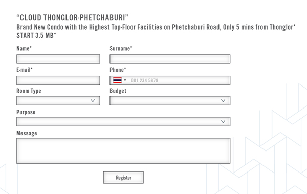 คลาวด์ ทองหล่อ- เพชรบุรี จะเปิดขายอย่างเป็นทางการ (พรีเซล) ในวันที่ 15-16 มิถุนายนนี้ ที่โรงแรม Park Hyatt พบโปรโมชั่นพิเศษในงาน พร้อมชมห้องตัวอย่างได้ที่สำนักงานขาย สามารถลงทะเบียนเพื่อรับข้อมูลเพิ่มเติมได้ที่ด้านล่างนี้