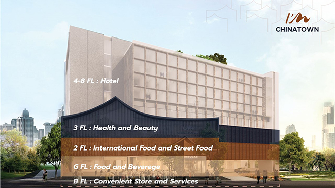 นางสรันทิพย์ กล่าวเสริมว่า "ในส่วนของศูนย์การค้า ซึ่งจัดว่าเป็นศูนย์การค้าเต็มรูปแบบเพียงแห่งเดียวของย่าน เยาวราช ปัจจุบัน บริษัทฯ สามารถปล่อยเช่าพื้นที่ได้แล้วถึง 95% และคาดว่าจะครบ 100% ภายในไตรมาส 3 นี้ โดยบริษัทฯ คาดว่าจะสามารถรับรู้รายได้จากการปล่อยเช่าพื้นที่อยู่ที่กว่า 100 ล้านบาทต่อปี ในส่วนของร้านค้า ภายในศูนย์ฯ ทางบริษัทฯ ได้มีการผสมผสานสินค้าและบริการให้มีความหลากหลาย เพื่อตอบรับความต้องการ ของกลุ่มลูกค้าที่เป็นทั้งคนที่มาเที่ยวหรือช้อปปิ้งย่านเยาวราช พ่อค้าแม่ค้า นักท่องเที่ยวและนักธุรกิจชาวต่างชาติ โดยแบ่งออกเป็น 4 ชั้น"