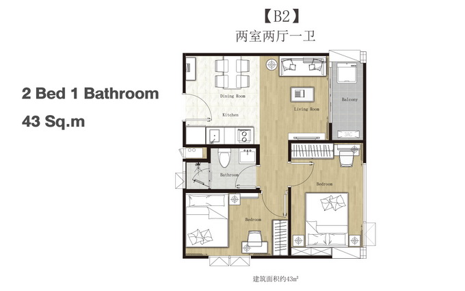 - แบบ 2 ห้องนอน 1 ห้องน้ำ พื้นที่ใช้สอยขนาด 39.61 - 56.16 ตร.ม.