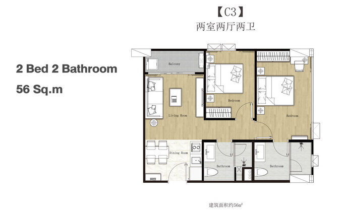 - แบบ 2 ห้องนอน 2 ห้องน้ำ พื้นที่ใช้สอยขนาด 47.99 - 56.16 ตร.ม.