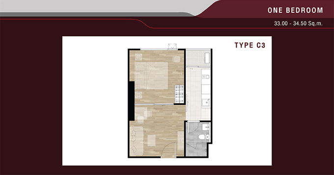 - 1 Bedroom Type C3 พื้นที่ใช้สอยขนาด 34.50 ตร.ม.