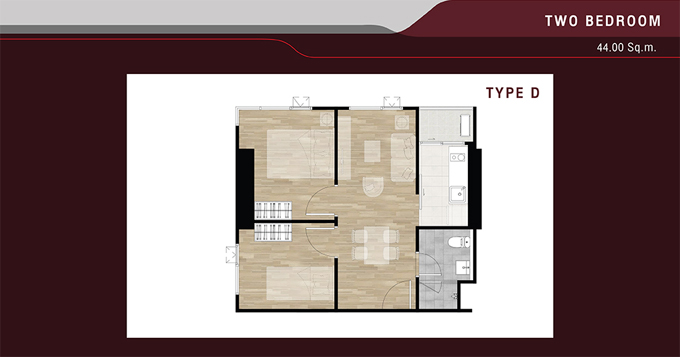 - 2 Bedrooms Type D พื้นที่ใช้สอยขนาด 44.00 ตร.ม.