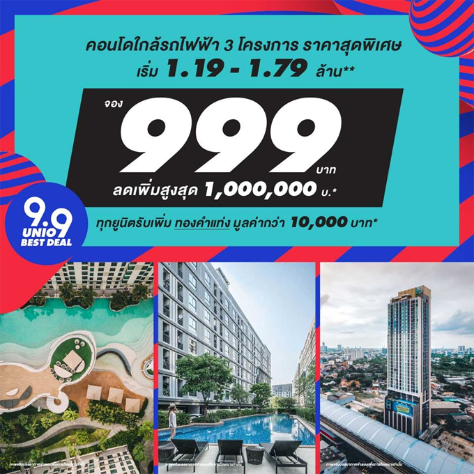 ภายใต้แบรนด์ ยูนิโอ และ ยูนิโอ ทาวน์ มอบโปรโมชั่นพิเศษมากมาย อาทิ จองเพียง 999 บาท ลดเพิ่มสูงสุด 1,000,000 บาท* จ่ายเพียง 9 บาท รับ Voucher ส่วนลด 50,000 บาท ฟรี! ค่าโอนกรรมสิทธิ์* และ ทุกยูนิตรับเพิ่มทันที!! ทองคำแท่ง มูลค่ากว่า 10,000 บาท* (เงื่อนไขเป็นไปตามบริษัทฯ) เมื่อช้อปผ่าน Shopee เท่านั้น พบกับดีลที่ดีที่สุด จำนวนจำกัด ตั้งแต่วันนี้ - 30 กันยายน 2562 ได้ที่ https://shopee.co.th/ananda_development_officialสอบถามรายละเอียดเพิ่มเติมได้ที่ โทร. 02-316-2222 หรือ www.ananda.co.thแท็กที่เกี่ยวข้อง :