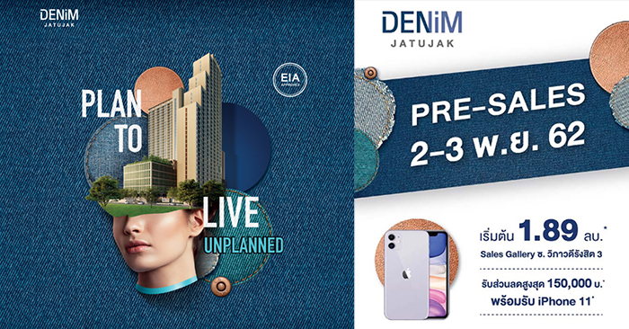 เดนิม จตุจักร (Denim Chatuchak) ภายใต้แนวคิด "PLAN TO LIVE UNPLANNED" ไม่มีเหตุผลให้ต้องคิด กับคอนโดที่แพลนไว้ให้ครบ บนทำเลสะดวกสบายใจกลางจตุจักร ศูนย์กลางการคมนาคม ใกล้ BTS หมอชิต และ MRT สวนจตุจักร ในราคาเริ่มต้นเพียง 1.89 ล้านบาท พบกับห้องชุดราคาพิเศษเฉพาะวันงานเท่านั้น