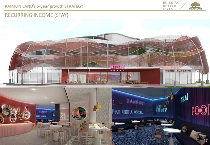 โดยคาดว่าจะสร้างเสร็จพร้อมเปิดให้บริการในช่วงต้นปี 2563 และอีก 1 แห่งคือ ทำเลย่านสุขุมวิท ภายใต้คอนเซ็ปต์ New Age Hotel จำนวน 220 ห้อง คาดว่าสร้างเสร็จและเปิดให้บริการภายในปี 2566 "โครงการโรงแรมทั้ง 2 แห่งดังกล่าวจะช่วยสร้างรายได้ประจำให้กับบริษัทเพิ่มขึ้นในอนาคต โดยภายใน 5 ปีข้างหน้า บริษัทฯ ได้ตั้งเป้าหมายจะมีโรงแรมที่มีห้องพักทั้งหมด 1,400 ห้อง สร้างรายได้ประมาณ 1,000 ล้านบาท ส่วนธุรกิจอาหารและเครื่องดื่ม (F&B) บริษัทฯ มีแผนที่จะขยายสาขาให้บริการเพิ่มขึ้นในประเทศแถบอาเซียน ซึ่งตั้งเป้าหมายจะมีรายได้รวมประมาณ 1,000 ล้านบาทภายใน 5 ปีข้างหน้าเช่นกัน" นายไลโอเนล ลี กล่าว