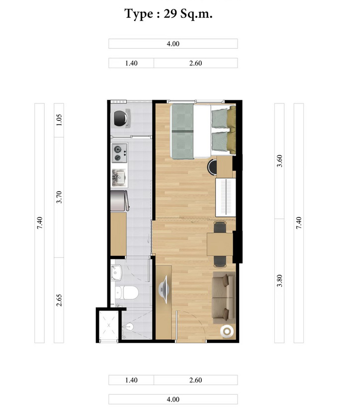 - 1 ห้องนอน พื้นที่ใช้สอยขนาด 29.00 ตร.ม.