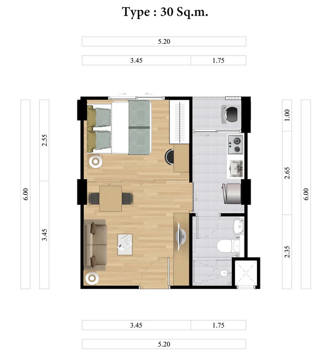 - 1 ห้องนอน พื้นที่ใช้สอยขนาด 30.00 ตร.ม.
