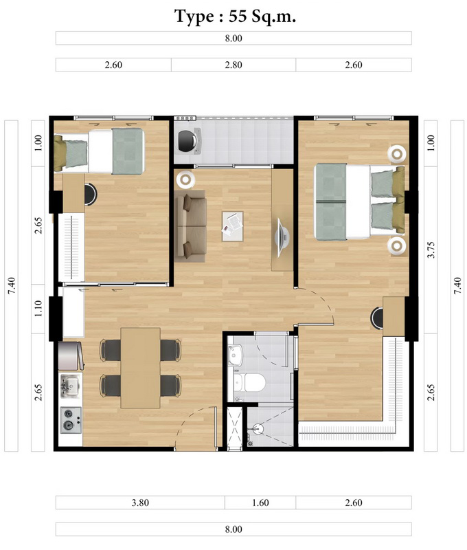 - 2 ห้องนอน พื้นที่ใช้สอยขนาด 55.00 ตร.ม.