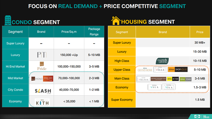 2.ปรับแบรนด์พอร์ตโฟลิโอ (Brand Portfolio) สร้างแบรนด์คอนโดใหม่ SLASH, SENA KITH และแบรนด์บ้านใหม่ SENA VILLE, SENA VILLAGE, SENA VELA, SENA VIVA เพื่อให้สอดรับกับกลุ่มเป้าหมายแต่ละเซ็กเมนต์ เน้นกลุ่มลูกค้า GEN Y - First Jobber