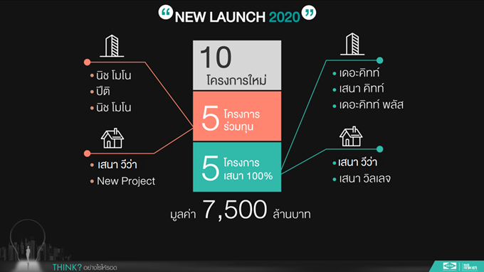 ผศ.ดร.เกษรา ธัญลักษณ์ภาคย์ รองประธานเจ้าหน้าที่บริหาร บริษัท เสนาดีเวลลอปเม้นท์ จำกัด (มหาชน) เปิดเผยถึงแผนธุรกิจปี 2020 เตรียมเปิดโครงการใหม่ ทั้งหมด 10 โครงการ รวมมูลค่า 7,500 ล้านบาท แบ่งเป็นโครงการแนวสูง 6 โครงการและแนวราบ 4 โครงการ ตั้งเป้ายอดขาย 11,500 ล้านบาทและเป้ารายได้ 10,600 ล้านบาท ทั้งนี้เพื่อให้บรรลุตามเป้าหมายและการเติบโตทุกปีของบริษัท ภายใต้วิสัยทัศน์ "HOW TO THINK" จึงได้มีการวาง 5 แนวคิดหลักรุกธุรกิจอสังหาฯ ปี 2020 ดังนี้