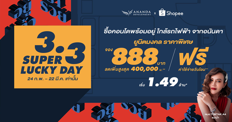 3.3 นี้ Super Lucky Day รีบรับโชค! กดเลยที่ Shopee จ่ายเลขสวย 888 บาท รับยูนิตมงคล หมอ Toktak แนะนำ คัดมาให้เน้นๆ จาก 2 โครงการพร้อมอยู่ ใกล้รถไฟฟ้า