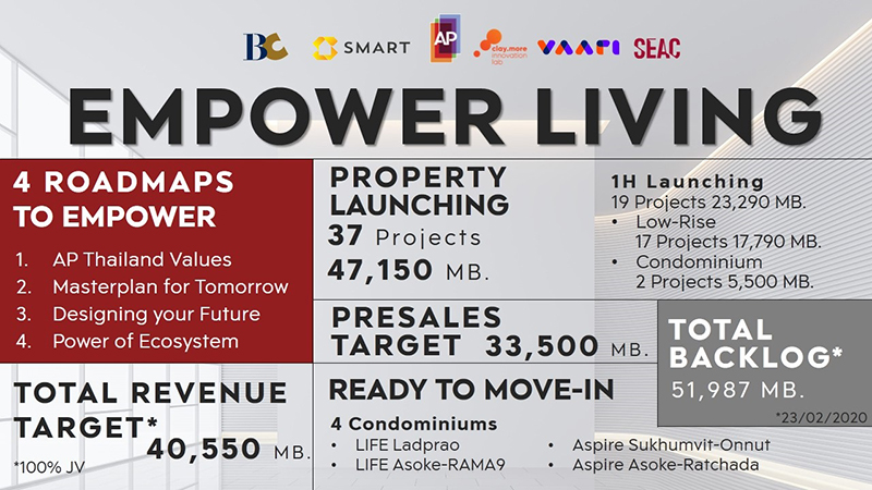 เอพี ไทยแลนด์ กรุ๊ป พลิกโฉมยุทธศาสตร์ขับเคลื่อนองค์กร ตั้งเป้าหมาย EMPOWER LIVING นำไปสู่การเป็นองค์กรที่พร้อมสนับสนุนให้ทุกคนในสังคมสามารถเติมเต็มทุกเป้าหมายชีวิตได้ตามที่ปรารถนา ด้วยนวัตกรรมสินค้าและบริการที่มีคุณค่าและมีความหมายต่อชีวิต ชู 4 กลยุทธ์สำคัญที่นำไปสู่ความสำเร็จ พร้อมเดินหน้ายกระดับความเข้มข้นในการทำงานที่เริ่มต้นจากคนภายในองค์กร ก่อนสะท้อนไปยังสินค้าและบริการที่พร้อมเอ็มพาวเวอร์ทุกมิติของชีวิต ตั้งเป้ารายได้รวมปี 2563 เท่ากับ 40,550 ล้านบาท