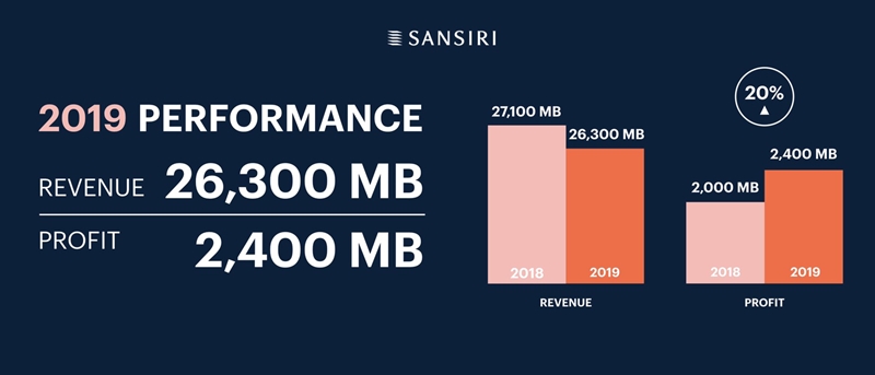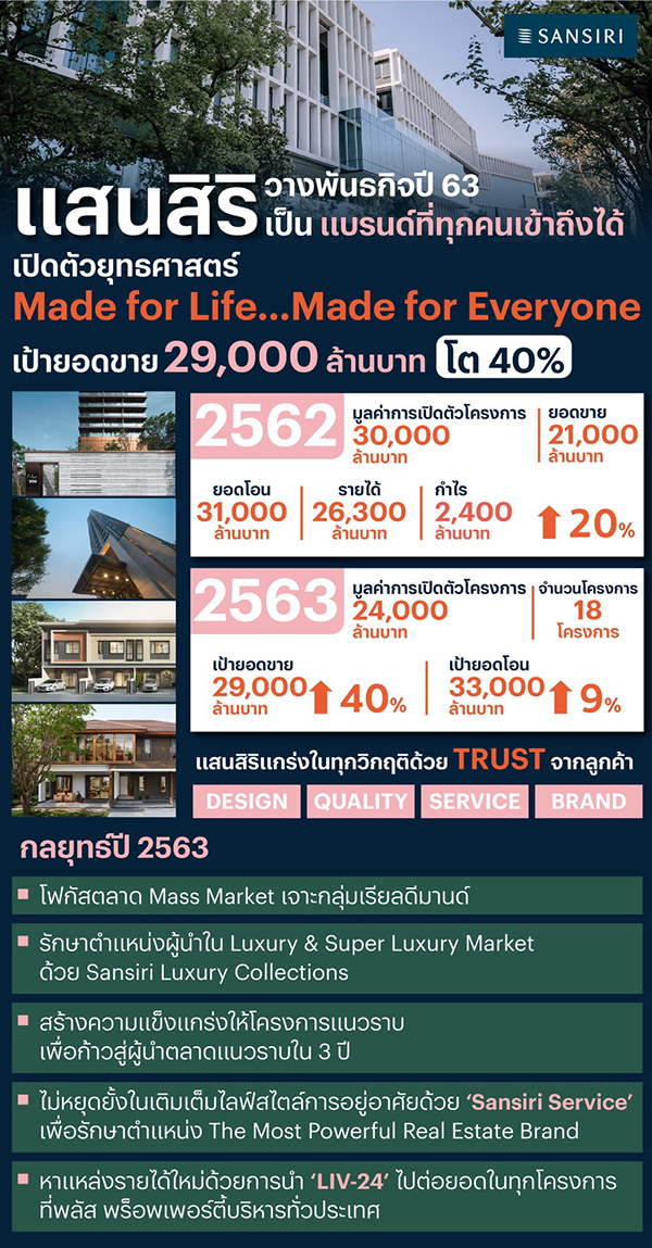 บริษัท แสนสิริ จำกัด (มหาชน) ผู้พัฒนาอสังหาริมทรัพย์ชั้นนำของไทยย้ำภาพแบรนด์ที่ลูกค้าเชื่อมั่น ประกาศความสำเร็จปี 62 ด้วยยอดรับรู้รายได้ 26,300 ล้านบาทกำไร 2,400 ล้านบาท เติบโตขึ้น 20% พร้อม เดินเกมส์รุกตลาดปี 63 ด้วยยุทธศาสตร์ "Made for Life Made for Everyone" โดยวางพันธกิจเป็น "แบรนด์ที่ทุกคนเข้าถึงได้" ส่ง 5 แบรนด์คุณภาพเซกเมนต์ Medium และ Affordable ตอบรับ Real Demand อาทิ "ดีคอนโด" "เดอะเบส" "สิริ เพลส" "อณาสิริ" "สราญสิริ" ด้วย 18 โครงการใหม่ มูลค่ารวม 24,000 ล้านบาท พร้อมรักษาความเป็นผู้นำในตลาดพรีเมี่ยม ด้วยโครงการพร้อมอยู่ระดับลักซ์ชัวรี่ภายใต้ Sansiri Luxury Collection ทั้งนี้ วางเป้าพรีเซลปี 63 สอดรับพันธกิจ 29,000 ล้านบาท เติบโต 40% และเป้าหมายยอดโอน 33,000 ล้านบาท ระบุเตรียมขยายแหล่งรายได้ใหม่เพิ่มความแข็งแกร่งด้วยการขยายฐานลูกค้า "LIV-24" ระบบรักษาความปลอดภัยแบบเรียลไทม์ ออกสู่โครงการที่บริหารโดยพลัส พร็อพเพอร์ตี้ ทั่วประเทศ