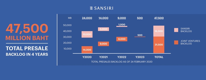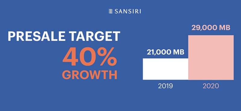 สำหรับในปี 2563 แสนสิริได้วางเป้าหมายพัฒนาโครงการใหม่ 18 โครงการ รวมมูลค่า 24,000 ล้านบาท แบ่งเป็นคอนโดมิเนียม 6 โครงการ มูลค่ารวม 8,800 ล้านบาท บ้านเดี่ยว 6 โครงการ มูลค่ารวม 8,600 ล้านบาท และทาวน์โฮม และมิกซ์ โปรเจกต์ 6 โครงการ มูลค่ารวม 6,600 ล้านบาท ซึ่งอยู่ในเซกเมนต์ Medium และ Affordable เป็นหลัก เพื่อให้ แสนสิริเป็นแบรนด์ที่เข้าถึงง่ายในกลยุทธ์ด้านการวางราคาขาย ขณะเดียวกันก็ขยายฐานลูกค้าในเซกเมนต์ Luxury และ Super Luxury ด้วยคอนโดมิเนียมพร้อมอยู่ภายใต้ Sansiri Luxury Collection อาทิ 98 ไวร์เลส, เดอะ โมนูเมนต์ ทองหล่อ, คุณ บาย ยู และ บ้านแสนสิริ โดยคาดว่าจะสามารถสร้างยอดขาย 29,000 ล้านบาทในปี 2563 เติบโตขึ้น 40% จากปีก่อนที่มียอดขาย 21,000 ล้านบาทรวมทั้งวางเป้าหมายการโอนไว้ 33,000 ล้านบาท นอกจากนี้ แสนสิริยังมียอดขายรอโอนรองรับการเติบโตระยะยาวในอีก 4 ปี อีกถึง 47,500 ล้านบาท ซึ่งช่วยสร้างความมั่นใจให้แสนสิริได้เป็นอย่างดี และเสริมความแข็งแกร่งในทุกสภาวะเศรษฐกิจ