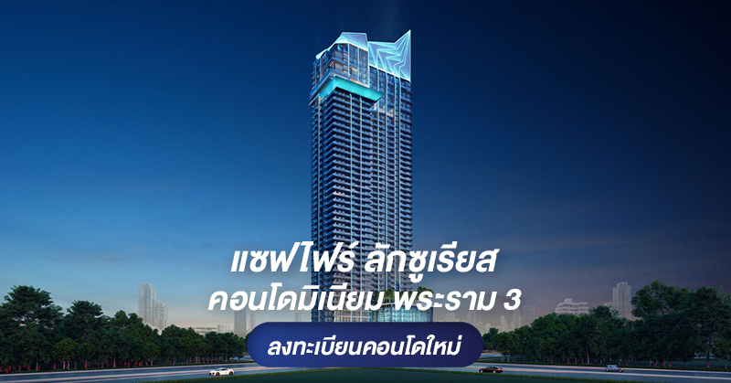 แซฟไฟร์ ลักซูเรียส คอนโดมิเนียม พระราม 3 คอนโดไฮไรส์ 44 ชั้น ริมโค้งแม่น้ำเจ้าพระยา แต่ราคาเริ่มต้น 2.4 ล้าน* ลงทะเบียนรับสิทธิพิเศษได้แล้ววันนี้