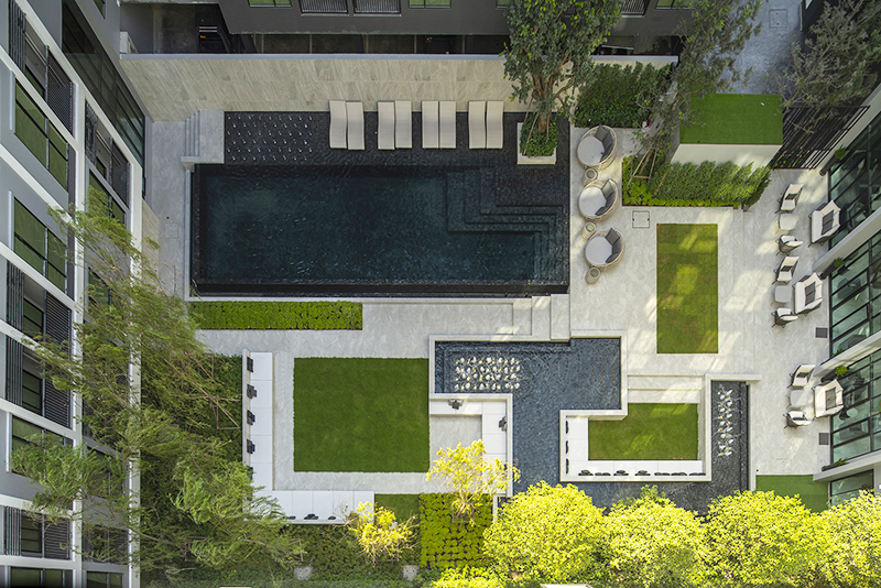 สระว่ายน้ำและสวนพักผ่อนที่ชั้น 1 ของโครงการ