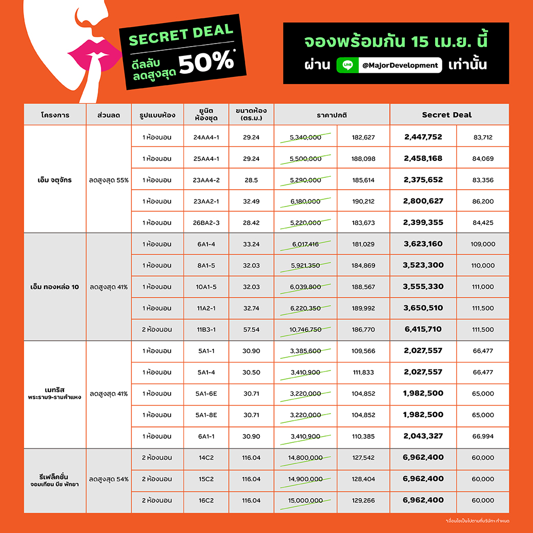 พร้อมขนทัพ 10 โครงการ บนทำเลดีที่สุดมาจัดเป็น Secret Deal โปรลับ!! ดีลพิเศษ ที่หาได้เฉพาะที่ช่องทางไลน์ใหม่นี้เท่านั้น กระซิบมาว่าลดสูงสุดกว่า 50% เปิดจองพร้อมกัน 15 เมษายนนี้ แอดไลน์ @MajorDevelopment กันไว้ได้เลย จะได้ไม่พลาดโอกาสคว้า ดีลดี ราคาแบบนี้มีจำนวนจำกัด