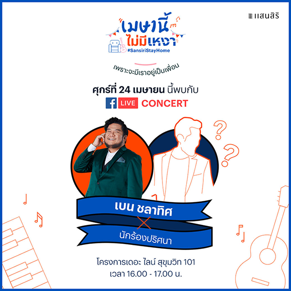แสนสิริ จัดขึ้นเอาใจลูกบ้านคอนโดเป็นเจ้าแรกของวงการอสังหาฯ แสนสิริ เดินหน้าสร้างความสุขเติมแต่งรอยยิ้มเอาใจลูกบ้านตลอดเดือนเมษายนนี้ กับการ Quarantine ที่จะไม่เหงาอีกต่อไป เพราะแสนสิริ ขนทัพเหล่าศิลปินมาอยู่เป็นเพื่อนลูกบ้านครอบครัวแสนสิริกับ LIVE concert ตลอดทั้งเดือนเมษายนนี้ ใครที่พลาดความสนุกจากครั้งที่แล้ว มารอชมกันได้ต่อในวันศุกร์ที่ 24 เมษายนนี้ เตรียมเฝ้าหน้าเพจเฟสบุ๊คของแสนสิริ