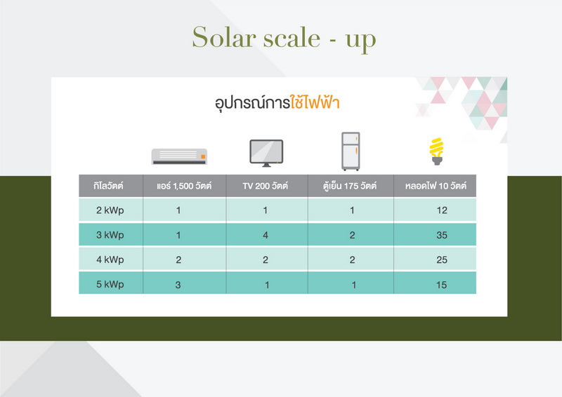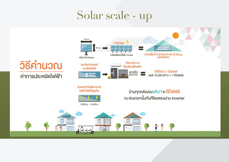 นอกจากนี้ ทางเสนามีบริการ "โซลาร์สเกลอัพ" (Solar Scale up) ที่เป็นนวัตกรรมคำนวณสเกลการใช้งานเป็นตัวช่วยเซอร์วิสลูกบ้านอีกทางหนึ่ง โดยลูกบ้านสามารถปรับ - ลดเพิ่มจำนวนแผงโซลาร์ได้ตามลักษณะการใช้งานของเครื่องใช้ไฟฟ้าภายในบ้าน และสามารถเลือกช่วงเวลาการใช้ไฟฟ้าได้ตามพฤติการหรือไลฟ์สไตล์ของผู้อยู่อาศัยในบ้าน ยกตัวอย่าง การคิดคำนวณเป็นมูลค่าเงินที่ประหยัดได้ หากมีการใช้ไฟ 4 ชม. ช่วง 10.00-14.00 น. ผลิตไฟฟ้า 2.1 กิโลวัตต์ เท่ากับมีการใช้ไฟฟ้า 8 หน่วย คูณค่าไฟของรัฐหน่วยละ 4 บาท จะประหยัดไฟวันละ 32 บาท หรือ 960 บาท/เดือน