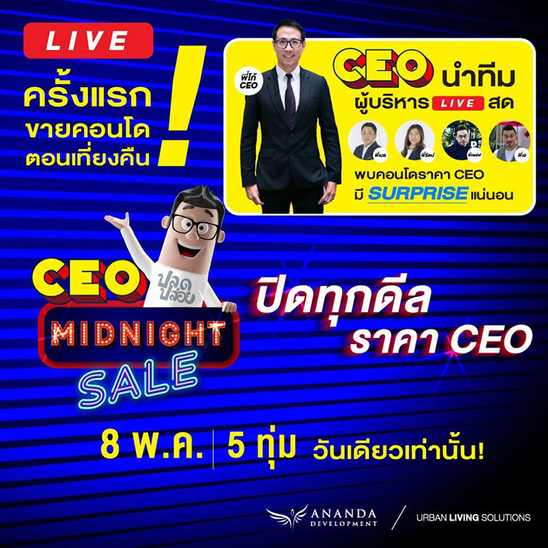 ครั้งแรกของวงการอสังหา! กับการพลิกกลยุทธ์รับโควิด-19 งานนี้ CEO มาเอง LIVE สด MIDNIGHT SALE เคาะราคาดีลพิเศษ ขายคอนโดตอนเที่ยงคืน โอกาสดีสำหรับผู้บริโภค ในการเป็นเจ้าของที่อยู่อาศัยคุณภาพเยี่ยม บนทำเลศักยภาพติดรถไฟฟ้าใจกลางเมือง กับ ค่าย อนันดา ดีเวลลอปเม้นท์ โดยผู้บริหารหนุ่ม คุณชานนท์ เรืองกฤตยา ประธานเจ้าหน้าที่บริหาร และกรรมการผู้จัดการใหญ่ พร้อมทีมผู้บริหาร จัดกิจกรรม Facebook LIVE ขายคอนโดแบบ Midnight Sale เคาะราคาดีลพิเศษ พร้อมโปรโมชั่นเพิ่มเติมที่พลาดไม่ได้ กับยูนิตพิเศษจำนวนจำกัดเพียงไม่กี่ยูนิต