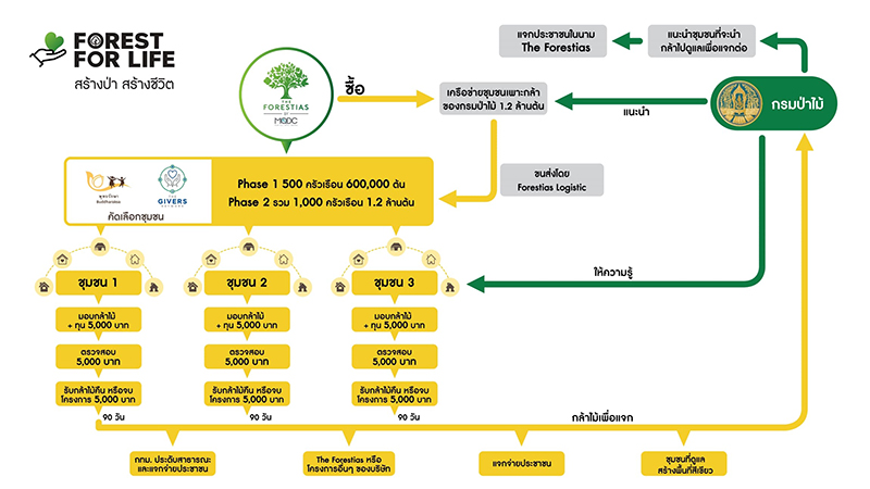 จึงได้จัดโครงการ 'Forest for Life สร้างป่าสร้างชีวิต' โดยที่จะนำกล้าไม้ไปให้ครอบครัวที่เข้าร่วมเป็นเครือข่ายตามที่กำหนดจากชุมชน นำไปดูแลอนุบาลให้เติบโตขึ้น เป็นระยะเวลา 90 วัน หรือ 3 เดือนโดยประมาณ โดยจะมีเงินช่วยเหลือให้ 5,000 บาทต่อครอบครัว โดยแบ่งจ่ายเป็น 3 งวด รวม 15,000 บาท จากนั้นกล้าไม้จะถูกนำไปแจกจ่ายให้กับหน่วยงานราชการ เช่น กองสาธารณะ กรุงเทพมหานคร สำหรับสร้างเสริมพื้นที่สีเขียวหรือนำไปร่วมโครงการแจกกล้าไม้คนเมือง บางส่วนนำมาใช้กับโครงการของ The Forestias แจกจ่ายประชาชนทั่วไป หรือชุมชนที่รับต้นกล้าไปดูแลต้องการพื้นที่สีเขียว ก็จะมอบให้ เพื่อเป็นการเพิ่มพื้นที่สีเขียว