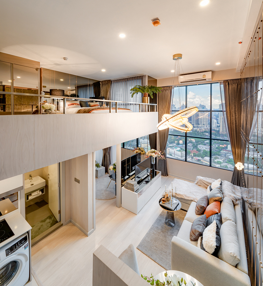 ห้อง DUO SPACE 24+10 ตร.ม. ดีไซน์พิเศษ ที่เพิ่มพื้นที่ความโปร่ง ด้วยการยกระดับฝ้าในโถงกลาง และมีชั้นลอยที่การออกแบบแบ่งสัดส่วนการใช้งานแทนกำแพง ทำให้เกิดความโล่ง ทันสมัย และเป็นเอกลักษณ์พิเศษเฉพาะตัว ที่ไม่มีใครเหมือน