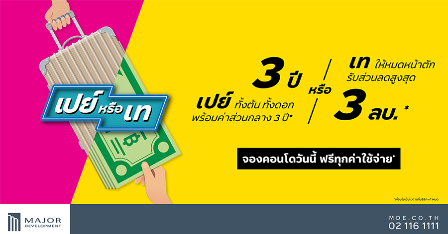 โอกาสเดียวที่คุณจะได้ครอบครอง คอนโดทำเลคุณภาพที่ดีที่สุด ห้ามพลาด เมเจอร์ เปย์ หรือ เท กับ 6 โครงการที่สามารถเลือกความคุ้มค่าได้เอง คนชอบเปย์ อยู่ฟรีนานสุด 3 ปี หรือ คนชอบเท รับส่วนลดสูงสุด 3 ล้านบาท พร้อมข้อเสนอสุดพิเศษ เมื่อจองทันที รับฟรี!! ทุกค่าใช้จ่าย