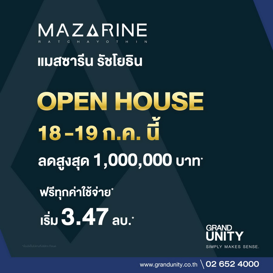 "แมสซารีน รัชโยธิน" (MAZARINE Ratchayothin) มีกำหนดจัดงาน Open House ในวันที่ 18 - 19 กรกฎาคม 2563 นี้ พร้อมมอบโปรโมชั่นสุดพิเศษมากมาย ไม่ว่าจะเป็นส่วนลดสูงสุด 1,000,000 บาท* ฟรีทุกค่าใช้จ่าย* รับ cash back x 2 สูงสุดถึง 100,000 บาท* และหากจองพร้อมทำสัญญาภายในงาน และโอนกรรมสิทธิ์ภายในเดือนกรกฎาคม รับฟรี เครื่องฟอกอากาศ DYSON มูลค่า 28,900 บาท* มีจำนวนจำกัด