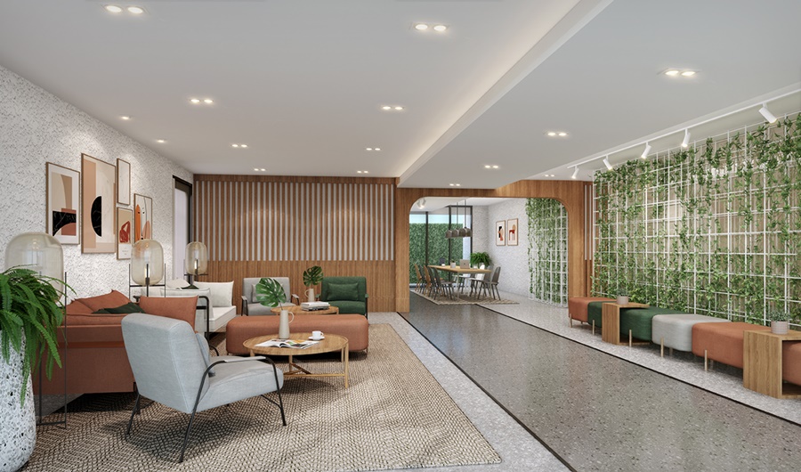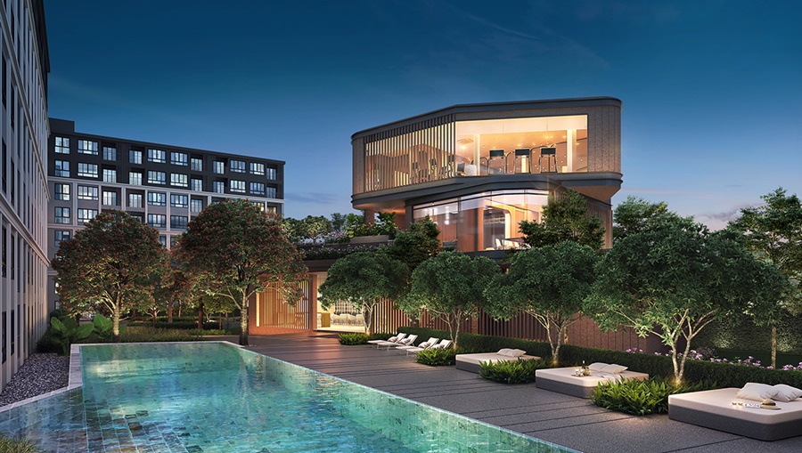 การออกแบบตัวอาคารด้วยการเลือกใช้ระแนงไม้มาเป็นส่วนหนึ่งในการออกแบบ ให้บรรยากาศเหมือนการมาพักผ่อนในที่พักสไตล์รีสอร์ท อาคารคลับเฮ้าส์ 3 ชั้น ใช้เทคนิคการเรียงตัวสลับกัน เปรียบเสมือนก้อนหิน แห่งท้องทะเลที่เรียงตัวซ้อนกันขึ้นไป ล็อบบี้มีการนำวัสดุเมืองร้อนผสมกับวัสดุและของตกแต่งสมัยใหม่อย่างเหล็กและหินขัด terrazo ให้ดูร่วมสมัย เน้นสไตล์การพักผ่อนแบบ tropical in modernity Co-Working และ Meeting Area ใช้เทคนิคการไหลของสีเขียวของพืชนานาพันธุ์จากภายนอกให้มาบรรจบกับสายลมที่พัดผ่านเข้ามาในพื้นที่ semi outdoor เชื่อมต่อกับ infinity pool ด้วยฟังก์ชันการใช้งานที่หลากหลาย และเพิ่มสีสันในตัวเฟอร์นิเจอร์ด้วยการตกแต่งให้เข้ากับกลุ่มเป้าหมายที่เป็นนักศึกษา นอกจากนั้นยังเพียบพร้อมด้วยสิ่งอำนวย ความสะดวกครบครันที่ทางโครงการเตรียมไว้ให้ ได้แก่ สระว่ายน้ำและ มุมพักผ่อนในสวน เอาใจเทรนด์คนรักสุขภาพด้วย ฟิตเนสและลู่วิ่ง ตลอดจนสวนผักออแกนิกส์สดใหม่แบบปลอดสารสำหรับการอยู่อาศัยยุค New Normal ให้ผู้อยู่อาศัยได้ใช้ชีวิตอย่างอิสระในทุกวัน
