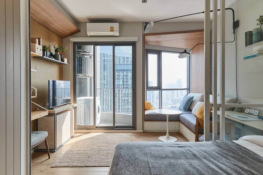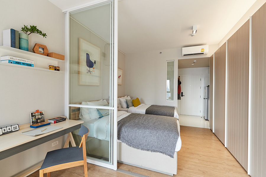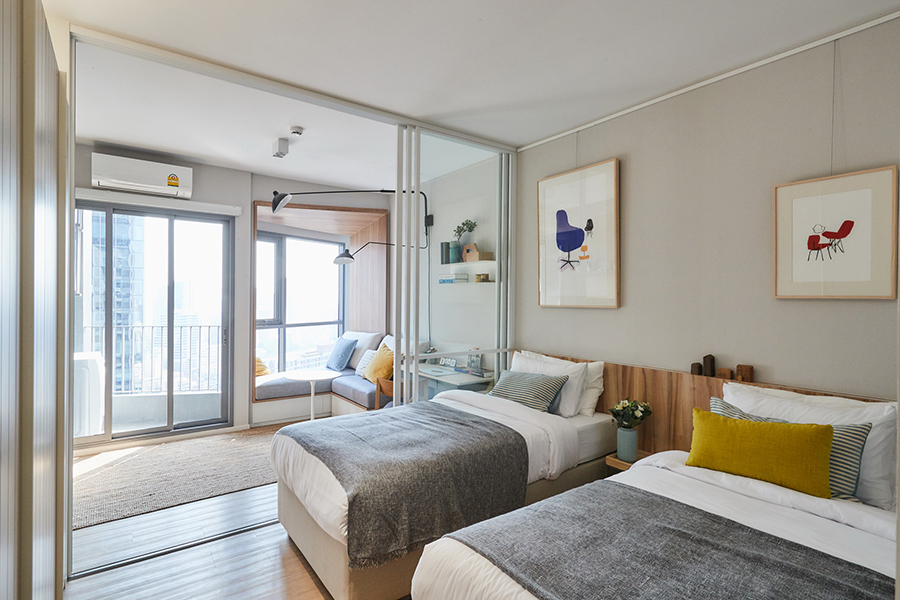ในแง่ของดีที่ 2 สินค้าดี ด้วยโครงการฯ คำนึงถึง Customer Insight คือเข้าใจความต้องการเชิงลึกของผู้อยู่อาศัยอย่างแท้จริง ดังนั้นทั้งวัสดุที่ใช้รวมถึงดีไซน์การออกแบบส่วนต่างๆ เราจึงคำนึงถึงการใช้สอยได้จริงและตอบโจทย์คนทุกเจนเนอเรชั่นอย่างตรงจุดและครบครัน โดยการออกแบบพื้นที่ห้อง อาทิ แบบห้อง 1 ห้องนอน ขนาด 34 ตารางเมตร เมื่อเปิดห้องเข้ามาจะเจอพื้นที่ครัว ทางโครงการได้เตรียมเตียง Twin Beds บิ๊วท์-อิน ตู้เสื้อผ้า และมีเตียง Daybeds เพื่อนั่งเล่นชมวิวภายนอก พร้อมดีไซน์ระเบียงให้เอียงออกด้านนอก แม้จะหันหน้าเข้าอาคารสำนักงานก็สามารถรับมุมมองที่กว้างขึ้น นอกจากนี้ยังออกแบบให้เหมาะกับการอาศัยอยู่ 2 คน ด้วยคำนึงถึงการใช้แต่ละพื้นที่พร้อมๆ กันอย่างลงตัว แบบห้อง 1 ห้องนอน ขนาด 40 ตารางเมตร จะมีขนาดพื้นที่ใหญ่ขึ้นมีการแบ่งเป็นส่วนส่วนชัดเจนมากขึ้น แต่ยังคงให้สิ่งอำนวยความสะดวกเช่นเดียวกันกับห้อง 34 ตารางเมตร และแบบห้อง 2 ห้องนอน 68 ตารางเมตร ห้องนอนหลัก (Master) ออกแบบให้มีห้องน้ำในตัว ห้องแต่งตัว และโซนลิฟวิ่ง ขณะที่ห้องนอนรอง จัดเป็น Twin Beds เหมาะกับการอยู่อาศัยแบบครอบครัว 2-4 คน