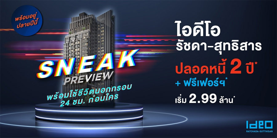 ไอดีโอ รัชดา-สุทธิสาร จัดโปรโมชั่นเร้าใจ... เอาใจคนซื้อคอนโดพร้อมอยู่ปลายปีนี้ โปรปลอดหนี้ 2 ปี หมดกังวลกับเรื่องการผ่อนคอนโด... เพราะไอดีโอผ่อนให้ นาน 2 ปี! เริ่ม 2.99 ล้าน*