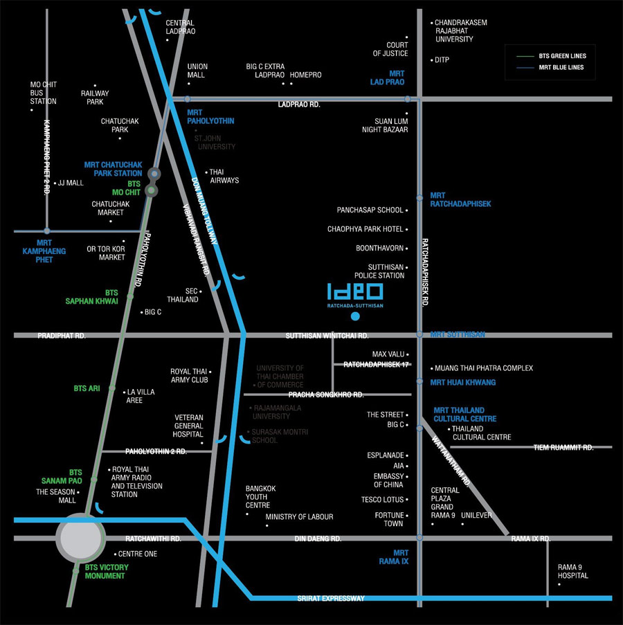 สำหรับตัวโครงการตั้งอยู่บนถนนสุทธิสารวินิจฉัย ห่างจาก MRT ประมาณ 450 เมตร ซึ่งเป็นระยะที่เดินได้ และเพียง 5 สถานีถึงอโศก ภายในซอยเต็มไปด้วยร้านค้า และร้านอาหาร ใกล้แหล่งไลฟ์สไตล์ชั้นนำ อาทิ เซ็นทรัล ลาดพร้าว, ยูเนี่ยน มอลล์, The Street รัชดา, Esplanade รัชดา