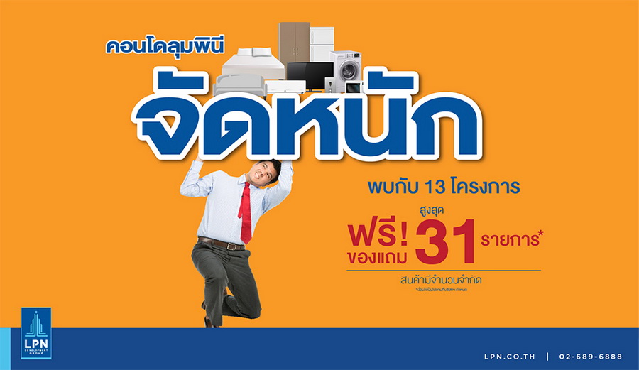 LPN เปิดตัวแคมเปญ "คอนโดลุมพินี จัดหนัก" ฟรี! ของแถมสูงสุด 31 รายการ กับ 13 คอนโดพร้อมอยู่ สามารถลากกระเป๋าเข้าอยู่ได้ทันที อาทิ เครื่องใช้ไฟฟ้า เฟอร์นิเจอร์ ค่าใช้จ่ายการโอนกรรมสิทธิ์ ตอบโจทย์ทุกเรื่องอยู่อาศัยจากแบรนด์ "ลุมพินี" ภายใต้ "ความพอดี ที่ดีกว่า" ในราคาจับต้องได้ (Affordable Price) เริ่มต้น 9.3 แสนบาท - 3.89 ล้านบาท กับรูปแบบห้องชุดที่ลงตัว (New LPN Design) ครบทุกฟังก์ชั่นและพื้นที่ส่วนกลางขยายความสุขคำว่าบ้านไม่สิ้นสุด