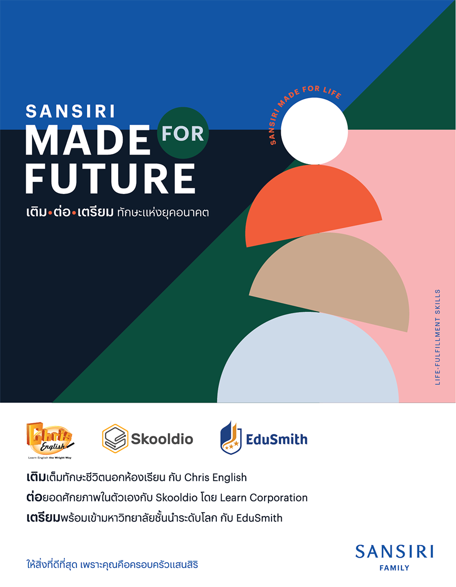 แคมเปญ Sansiri Made for Future เติม-ต่อ-เตรียม ทักษะแห่งยุคอนาคต นำเสนอในรูปแบบคอนเทนท์วิดีโอซีรีส์พิเศษ รายการเพื่อการศึกษาที่สนุกสนาน เข้าใจง่าย ได้สาระความรู้นอกจากห้องเรียน รวมถึง Infographic content เผยแพร่ผ่านช่องทาง โซเชียลมีเดียต่างๆ ของแสนสิริ ได้แก่ Facebook @SansiriFamily, YouTube @sansiriplc