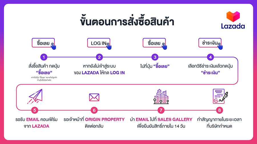 - รอรับอีเมลยืนยันจาก ลาซาด้า และอีเมลจากทาง ออริจิ้น พร็อพเพอร์ตี้ โดยทางโครงการจะติดต่อกลับเพื่อยืนยันภายใน 24 ชั่วโมง