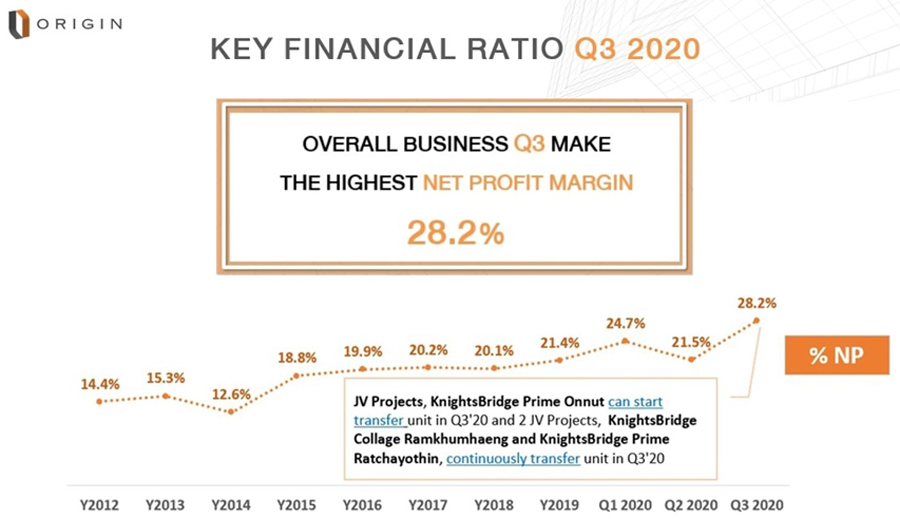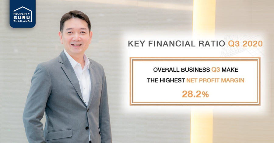 "ปีนี้กำไรของเราโดดเด่นติดท็อป 5 ได้ในทุกไตรมาส เนื่องจากปีนี้เป็นปีแรกที่เราเริ่มเก็บเกี่ยวผลงานจากโครงการร่วมทุนหรือ JV โดยโครงการ JV ที่สร้างเสร็จของเราในปีนี้ทุกโครงการล้วนมีกิจกรรมการโอนที่โดดเด่นและต่อเนื่อง โดยเฉพาะในไตรมาส 3/2563 ยอดโอนโครงการ JV ของเราทำสถิตินิวไฮที่ 1,689 ล้านบาท ส่วนสำคัญ มาจากโครงการคอนโดมิเนียม JV สร้างเสร็จใหม่คือ โครงการ ไนท์บริดจ์ ไพร์ม อ่อนนุช ที่มียอดโอนสูงถึง 1,000 ล้านบาท ทำให้เรามีส่วนแบ่งกำไรจากโครงการ JV อย่างยอดเยี่ยม ส่งผลให้อัตรากำไรสุทธิ หรือ Net Profit Margin เติบโตขึ้นมาอยู่ที่ 28.2% ซึ่งสูงที่สุดเท่าที่บริษัทเคยทำมา" นายพีระพงศ์ กล่าว