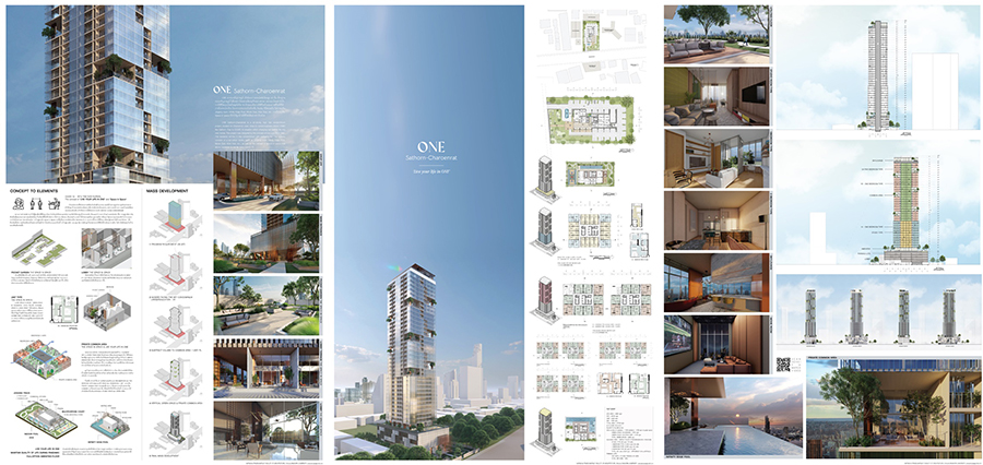 นางสาวณัฐณิชา แพรสุวัฒน์ศิลป์ ชื่อผลงาน ONE Sathorn - Charoenrat แรงบันดาลใจของผลงานมาจาก การตอบสนองความต้องการของการใช้ชีวิตแบบใหม่ New Normal Concept จะมีส่วนของการแบ่งพื้นที่เล็กในพื้นที่ใหญ่ เพื่อให้มีความเกิดความเป็นส่วนตัวให้กับลูกบ้านที่จะมาใช้งานต่างๆ