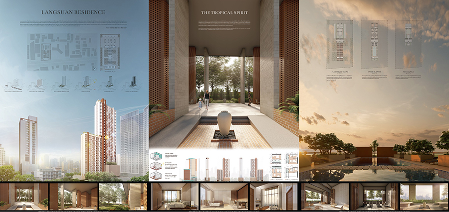นายกฤตชัย ชวนบุญ ชื่อผลงาน LANGSUAN RESIDENCE แรงบันดาลใจของผลงานมาจากการเลือกพัฒนาพื้นที่ส่วนกลางให้มีความรู้สึกสงบและมีความเป็นส่วนตัว จากการเปลี่ยนแปลงพฤติกรรมและวิถีชีวิตไปจากเดิม ไม่ออกไปข้างนอก อยู่ในบ้านตัวเอง เริ่มกลับมาทำงานที่บ้าน
