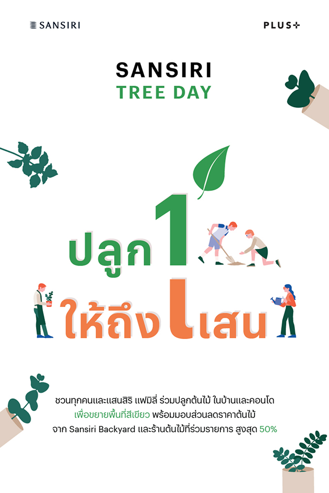 พบกับ Sansiri Tree Day ปีที่ 2 ร่วมปลูก "หนึ่ง" ให้ถึง "แสน" สร้างความสุขช่วง Work from Home สนุกไปกับการขยายพื้นที่สีเขียวอย่างไร้ขีดจำกัดที่บ้านและคอนโดของคุณ กับโปรโมชั่นต้นไม้ส่วนลดสูงสุด 50% ที่ Sansiri Backyard และร้านต้นไม้ที่ร่วมรายการใกล้บ้านคุณ พร้อมลุ้นรับต้นไม้ยอดฮิต! เพียงแชร์รูปต้นไม้ที่คุณปลูกในมุมโปรด และติด #SansiriTreeDay บน Sansiri PLC Facebook Page ตั้งแต่วันที่ 19-31 มกราคม 2563