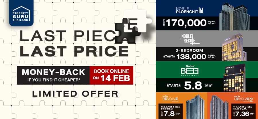 บริษัท โนเบิล ดีเวลลอปเมนท์ จำกัด (มหาชน) เปิดปรากฏการณ์ใหม่กล้าท้าทำราคาดีที่สุด ภายใต้แคมเปญ "LAST PIECE, LAST PRICE" การันตีคืนเงิน หากเจอราคาถูกกว่า* มอบโอกาสให้คุณเป็นเจ้าของคอนโดมิเนียมพร้อมอยู่ 5 โครงการ ได้แก่ โครงการโนเบิล เพลินจิต โนเบิล รีโคล โนเบิล บี33 โนเบิล รีวอล์ฟ และโนเบิล รีวอล์ฟ รัชดา2 บนทำเลที่ดีที่สุดใจกลางเมือง ติด BTS และ MRT ไม่กี่ยูนิตสุดท้าย ในราคาเริ่มต้นเพียง 5.8 ล้านบาท*