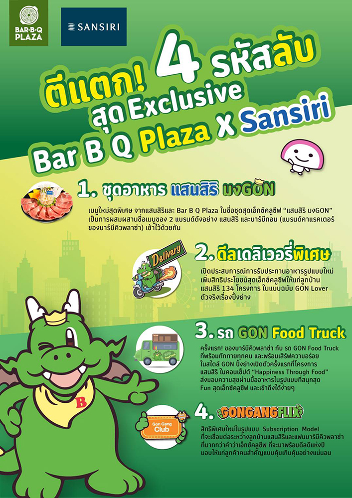 ด้าน บุณย์ญานุช บุญบำรุงทรัพย์ ประธานเจ้าหน้าที่บริหาร ด้านการสร้างโอกาสทางการตลาดกลุ่มธุรกิจอาหาร บริษัท ฟู้ดแพชชั่น จำกัด เผยว่า ถือเป็นโอกาสอันดีที่ทางบาร์บีคิวพลาซ่า ได้มาจับมือเป็นพันธมิตรหลักกับ แสนสิริ ภายใต้แนวคิด Stay with customers ซึ่งการอยู่เคียงข้างลูกค้าในช่วงสถาณการณ์โควิด 19 ระลอกใหม่นั้น ถือเป็นอีกหนึ่งกลยุทธ์หลักของ ฟู้ดแพชชั่น โดยเน้นย้ำในเรื่องการให้ความสำคัญกับการดำรงชีวิตด้วยปัจจัยสี่ ท่ามกลางการเปลี่ยนแปลงของการใช้ชีวิตที่เปลี่ยนไปของผู้คน ครั้งนี้จึงเป็นการร่วมมือผนึกกำลังครั้งใหญ่ของสองอุตสาหกรรม ในการทำโมเดล Licensing Partnership จากการที่เรามีความแข็งแกร่งและเชี่ยวชาญเรื่องการทำ Character Marketing ซึ่งเป็นโอกาสอันดีในการต่อยอดสำหรับการสร้างรายได้ช่องทางใหม่ให้กับองค์กร ด้วยการใช้มาสคอต บาร์บีกอน ที่เป็นตัวแทนของความสุข ไป Stay with customers ในทุกๆ กิจกรรมการตลาด และเพื่อสนับสนุนให้พาร์ทเนอร์ไปถึงเป้าหมายที่ต้องการเข้าถึงกลุ่มลูกค้าใหม่ๆมากขึ้น เช่น การขยายฐานไปยังกลุ่มลูกค้าที่เป็น GON Lover สำหรับครั้งนี้จึงถือเป็นการเชื่อมต่อวงการธุรกิจร้านอาหาร และ วงการอสังหาฯ เข้าไว้ด้วยกันอย่างแท้จริง โดยได้รับผลตอบรับดีจนเกิดกระแสไวรัลแคมเปญทั้ง ออฟไลน์ และออนไลน์ ซึ่งถือเป็นการเปิดศักราชใหม่ปี 2564 ที่จะยกขบวนความอร่อยมาพร้อมโปรโมชั่นและดีลดีๆ มากมาย อาทิ ชุดอาหารสุดพิเศษ "แสนสิริ มงGON" "GON Gang Delivery" "GON Food Truck" และ "GonGangFlix จาก Gon Gang Club" เพื่อสร้างรอยยิ้ม ความสนุก และ ความสุขให้แก่คนไทยทั้งประเทศ"