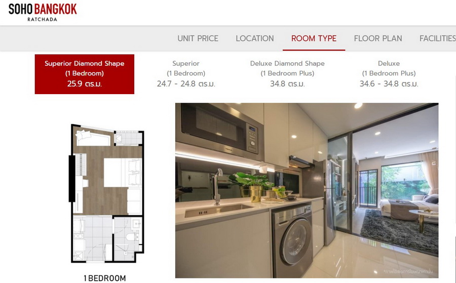 สำหรับ โซโห แบงค็อก รัชดา (SOHO Bangkok Ratchada) โครงการคอนโดมิเนียมแบบ High Rise สูง 24 ชั้น ตั้งอยู่บนเนื้อที่ขนาด 1-2-28 ไร่ จำนวนห้องพักอาศัย 341 ยูนิต และร้านค้า 1 ยูนิต มีห้องให้เลือก 4 รูปแบบ คือ 1 Bedroom 24.7-25.9 ตร.ม. และ 1 Bedroom Plus 34.8-34.9 ตร.ม. ทั้งแบบ Simplex เพดานสูง 2.6 เมตร และแบบ Duo Space คอนโดมิเนียม 2 ชั้น ฝ้าเพดานสูงพิเศษ 4.2 เมตร ตอบโจทย์ทุกการใช้งานของคนรุ่นใหม่
