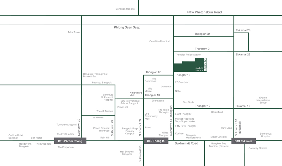 ที่ตั้งของโครงการอยู่ในโลเคชั่นใจกลางถนนทองหล่อ เพียงไม่กี่ก้าวก็สามารถไปถึง Community Mall ชั้นนำได้ อาทิ 72 Courtyard, J Avenue, Villa Market และใกล้ ๆ ยังมี The Commons, Seenspace, Eight Thonglor ที่อยู่ในระยะเดินเพียง 5 - 10 นาทีเท่านั้น อีกทั้งรอบโครงการยังมีแหล่งอำนวยความสะดวกอื่นๆ เช่น โรงพยาบาลสมิติเวช โรงเรียนนานาชาติ และแหล่งรวมร้านอาหาร Eatery & Entertainment ที่มีชื่อเสียง เป็นย่านที่เต็มไปด้วยสีสันของชีวิตคนเมืองอย่างแท้จริง การเดินทางสามารถเชื่อมต่อได้ทั้งถนนสุขุมวิทและถนนเพชรบุรี รวมถึงใกล้รถไฟฟ้า BTS สถานีทองหล่อ เรียกได้ว่าครบทุกสิ่งที่ต้องการบนถนนเส้นเดียว