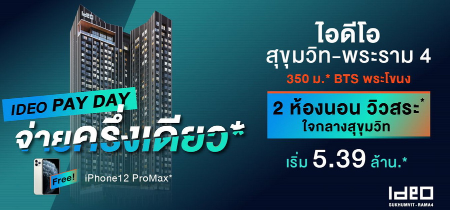 โปรโมชั่น : IDEO PAY DAY จ่ายครึ่งเดียว ฟรี! iPhone 12 ProMax* ระหว่างวันที่ 15 กุมภาพันธ์ 2564 - 30 มิถุนายน 2564 เท่านั้น