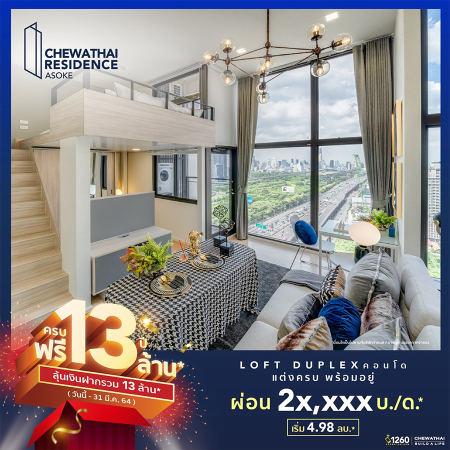 ชีวาทัย เรสซิเดนซ์ อโศก (Chewathai Residence Asoke) คอนโดพร้อมอยู่ ย่านอโศก-พระราม 9 สไตล์ Loft Duplex เพดานสูง 3.60 เมตร พร้อม เริ่ม 4.98 ล้านบาท*