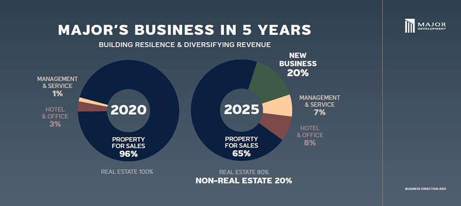"การพัฒนาที่อยู่อาศัยเพื่อการขายยังคงเป็นธุรกิจหลักของเมเจอร์ ดีเวลลอปเม้นท์ ในระยะยาว แต่ด้วยวิสัยทัศน์ที่ต้องการจะเป็น Lifescape Developer ที่ดูแลครอบคลุมทุกมิติในการใช้ชีวิตของผู้บริโภค เราจะพัฒนาตัวเองอย่างต่อเนื่องให้เป็น Future-Proof Company เป็นองค์กรที่มีพลวัต เดินไปข้างหน้าอย่างมั่นคงพร้อมกับธุรกิจใหม่ๆ ที่ตอบโจทย์ผู้บริโภค" นางสาวเพชรลดา กล่าว