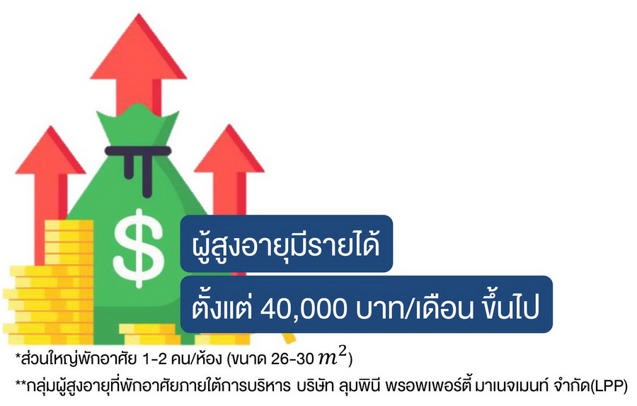 ทีมพัฒนางานบริการ(Service Development Center :SDC) ของ LPN Wisdom ได้สำรวจและวิจัยพฤติกรรมผู้สูงอายุในปี 2563 ขณะที่เกิดการแพร่ระบาดของโคโรน่าไวรัส สายพันธุ์ใหม่ 2019 (COVID-19) พบว่า กลุ่มผู้บริโภคที่เป็นผู้สูงอายุ (อายุตั้งแต่ 60 ปีขึ้นไป) ที่พักอยู่ในอาคารชุดภายใต้การบริหารของบริษัท ลุมพินี พรอพเพอร์ตี้ มาเนจเมนท์ จำกัด(LPP) เป็นกลุ่มที่มีกำลังซื้อโดยมีรายได้ไม่ต่ำกว่า 40,000 บาทต่อเดือน และมากกว่า 70% พักอาศัยอยู่ 1-2 คนในห้องขนาด 26-30 ตารางเมตร มีพฤติกรรมและความต้องการงานบริการที่แตกต่างไปจากเดิม โดยเฉพาะให้ความสำคัญกับ 4 ปัจจัยหลัก ประกอบด้วย การดูแลสุขภาพ (Health), การปรับปรุงสภาพแวดล้อมการอยู่อาศัย (Living Environment), ให้ความสำคัญกับโภชนาการอาหาร (Food), และ มีความสนใจในการใช้เทคโนโลยี (Technology) มากขึ้น ซึ่งเป็นทิศทางในการพัฒนาธุรกิจบริการของผู้ประกอบการด้านบริหารจัดการอาคารชุด รวมถึงผู้ประกอบธุรกิจที่เกี่ยวข้องกับผู้สูงอายุ ที่จะพัฒนาสินค้าและบริการเพื่อตอบโจทย์กับความต้องการของผู้สูงอายุในปี 2564 และในอนาคต